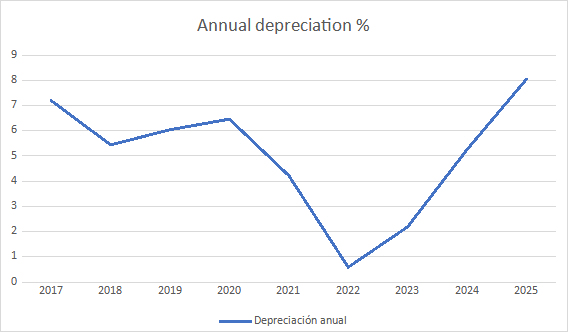 Subsequently, depreciation has been gradually increasing, reaching just 2.19% in 2023 and 5.25% in 2024, to stand at 8% in 2025. We expect this anticipated price adjustment to continue throughout 2026, although we are inclined to believe that it will not worsen but rather remain stable or even decrease over the next two years.